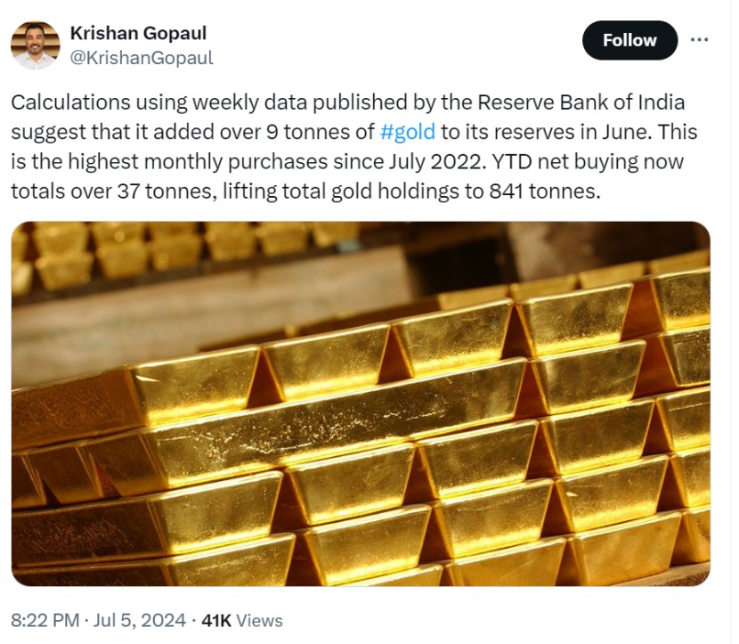 当地时间周五,世界黄金协会分析师 KrishanGopaul 在社交媒体平台 X 发帖表示,根据印度储备银行每周数据的计算,印度储备银行的黄金储备在 6 月份增加了 9 吨以上,为 2022 年 7 月以来的最高水平。