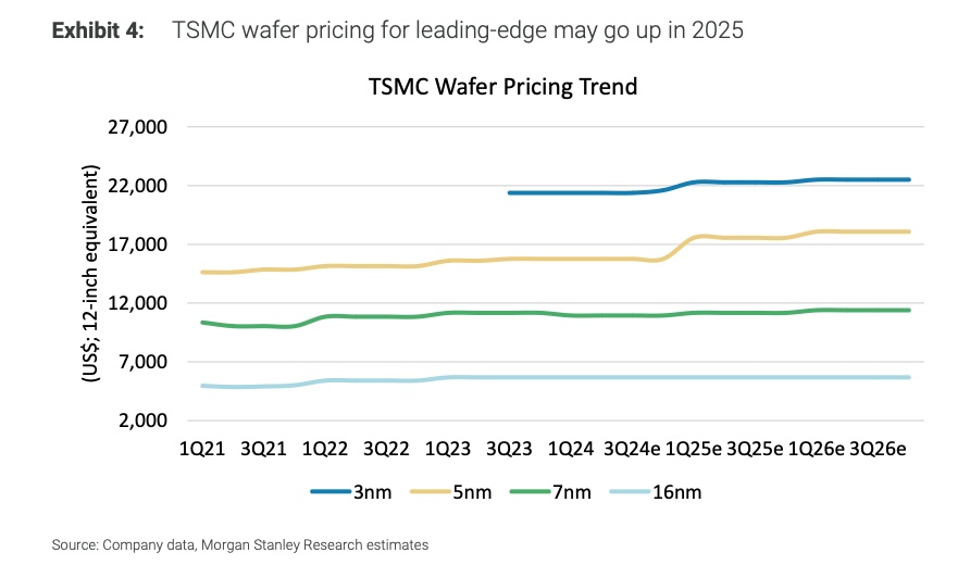 随后,台积电的涨价预期也随之发生了变化。大摩预计 2025 年台积电将: