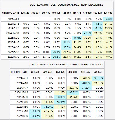 就鲍威尔周二的证词来看,由于在抑制通胀方面取得了 “适度的进一步进展”,美联储无疑离降息更近了一步。然而,政策制定者仍然需要确信,通胀正在持续向 2% 的目标迈进,这意味着本月晚些时候降息的可能性不大。考虑到美联储在过去一年的大部分时间里都在发表类似的言论,这对市场来说并无新意。根据 CME 美联储观察工具,市场目前预计美联储 7 月份降息的概率仅为 4.7%,而 9 月降息的概率超过 75%。
