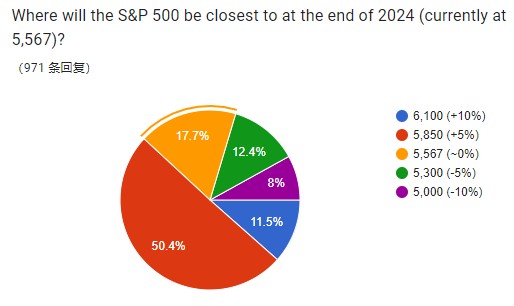 鲍威尔在美国国会的评论也被市场解读为偏向中性,没有出现鹰派信号,进而推动标普 500 指数周二创下新的收盘新高,创下该指数 2024 年以来的第 36 个纪录。根据 Seeking Alpha 最新的 7 月情绪调查,超过六成的受访者认为到 2024 年年底将上涨,其中近 50% 的受访者认为将上涨 5%。