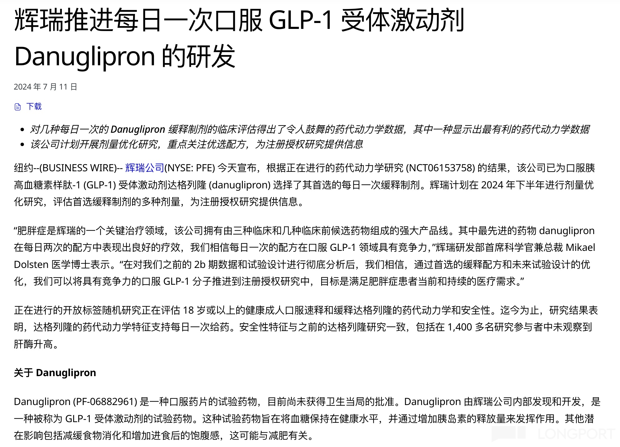 消息称,辉瑞推进每日一次减肥药的开发,将于下半年进行剂量优化研究。