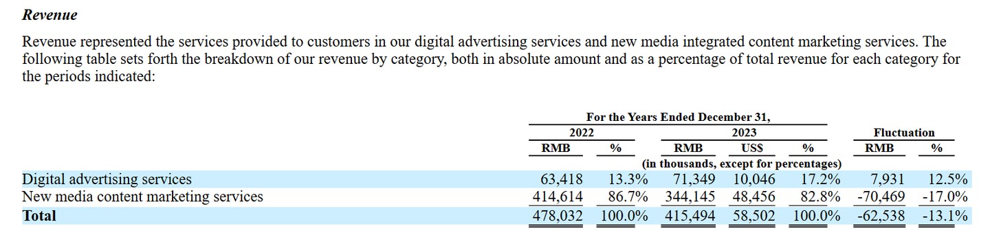 但进入 2023 年,旭航的持续成长戛然而止,该报告期内其收入下滑 13.1% 至 4.15 亿元,这主要是因为新媒体内容营销服务由于中小型客户数量减少导致该业务收入下滑 17%,即使数字广告业务因新增两名客户而录得收入同比增长 12.5% 也难以抵挡总收入的下滑。