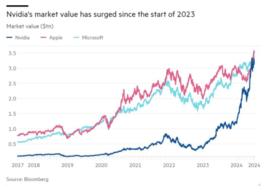 由于对生成式人工智能模型(如 OpenAI 的 ChatGPT)芯片需求激增,英伟达的股价今年以来飙升了 162%,其市值已突破 3 万亿美元,较 2018 年 8 月的约 1500 亿美元上涨了 20 倍。今年 6 月,英伟达短暂超越微软和苹果,成为世界上最有价值的上市公司。英伟达公司首席执行官黄仁勋称,公司正处于新的 “工业革命” 中心。