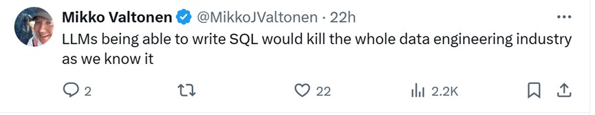一位用户声称:“正如我们所知,能够编写 SQL 的 LLM 将扼杀整个数据工程行业。”