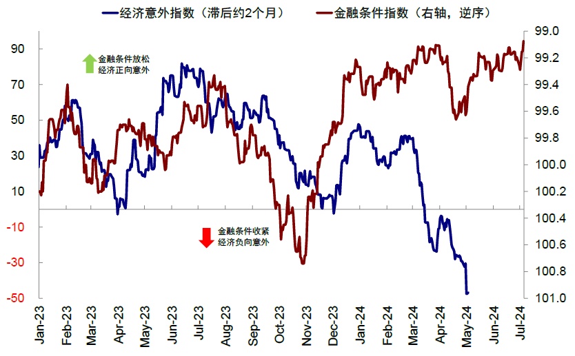 图表:金融条件指数从 6 月中旬开始走高,至 7 月 1 日区间高点抬升了 10bp,压制 6 月需求与增长