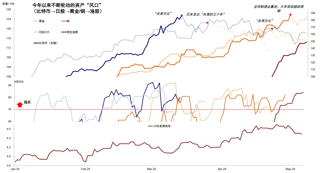 图表:今年以来不断轮动的资产 “风口”,从比特币到日股,到黄金与铜,再到港股,均伴随着过热情绪