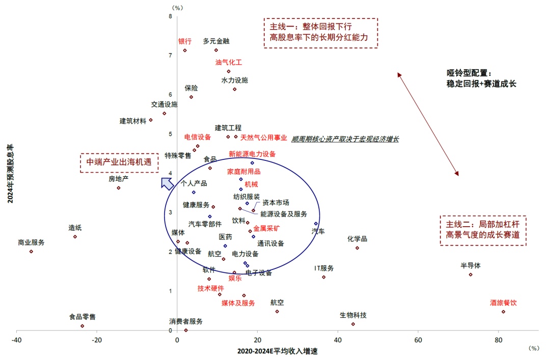 这一背景下,我们建议整体重点聚焦三个方向,即整体回报下行(稳定回报的高分红和高回购,即充裕现金流的 “现金牛”)、局部加杠杆(政策支持与仍有景气度的科技成长),局部涨价(天然垄断板块,上游与公用事业)。首先,高分红(传统的电信、能源、公用事业及部分互联网消费等稳定 “现金牛”)作为 “哑铃” 一端在整体回报率下行中具有长期配置价值。其次,部分政策支持或景气向上板块仍有望受到利好提振而体现出较大弹性。后续三中全会亦保有对出台对应新质生产力方向进一步扶持政策预期。由此看好部分景气向上板块,如电气设备、技术硬件、半导体、软件与服务等,这些领域仍有加杠杆可能与空间。第三,对比一些行业价格走低伤害利润率,涨价板块如天然气、有色金属及公用事业,甚至部分必需消费品,则可以通过保护企业利润率并享受更大的议价能力。