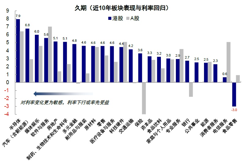 图表:久期较长板块如半导体、汽车(含新能源)、媒体娱乐、软件等或率先受益