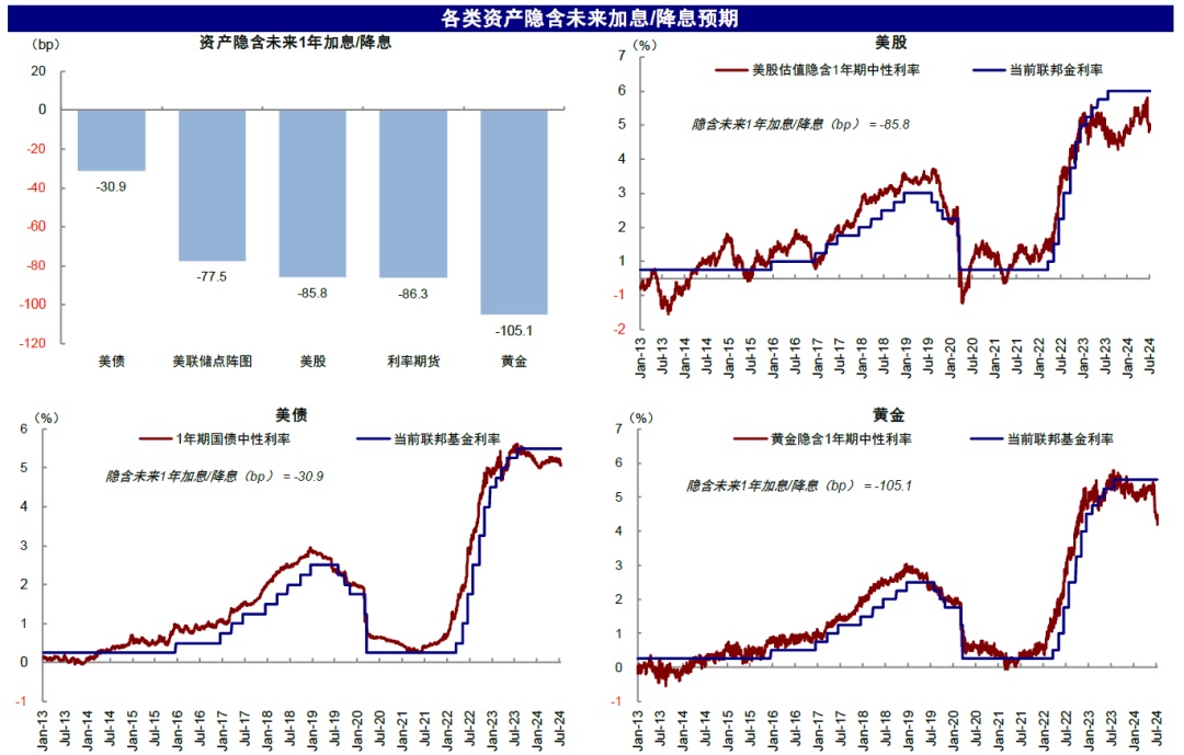 本轮降息周期与 2019 年更为类似,我们总结了如下三个特征:1)经济软着陆下降息幅度有限。由于经济基本面不差,降息后利率回落带动整体金融条件转松,可能激活私人部门投资和消费需求,因此并不需要连续的大幅的降息。我们测算本轮缓解货币政策的限制性和收益率曲线倒挂问题仅需降息 100bp(《测算美债利率的新思路》)。这也意味着外部压力缓解后国内央行打开大幅降息空间的期待仍需观察。2)降息交易已经 “抢跑”。当前市场对于降息次数的预期仍高于美联储点阵图所给出的指引,以及我们测算的货币政策回归中性所需的幅度。我们测算黄金计入最多,美债计入的较少。3)交易集中度高,轮动加快。复盘今年以来的几轮交易,如年初比特币和纳斯达克大涨,随后的日股、黄金、铜和港股市场,又再度切换回美股科技龙头。资金抱团带来的结果是一些交易较为集中,因此短期容易出现 “轮动” 导致的下跌,例如 CPI 公布后美股龙头科技股向小盘股的 “大切小”,以及中国市场黄金有色向银行地产的风格切换。