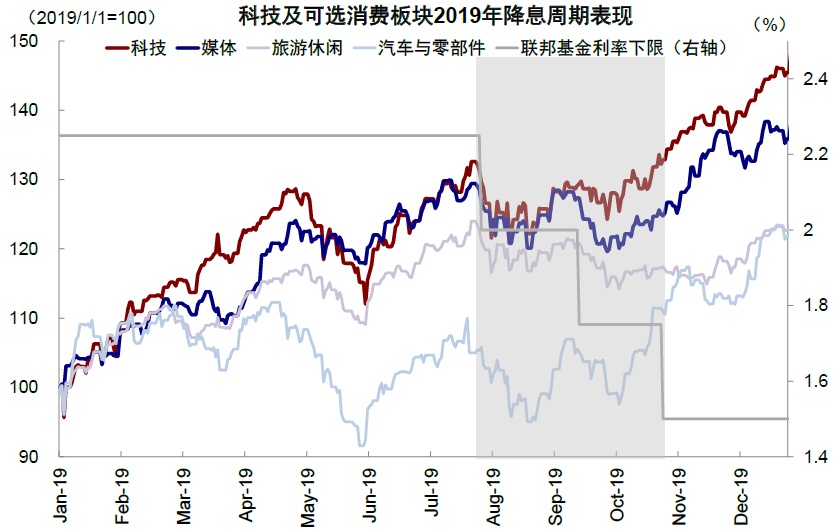 图表:降息前科技及媒体行业受益于降息预期,降息后汽车及零部件受益于需求改善