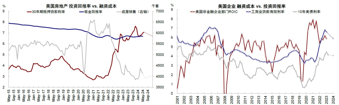 但这种交易面临金融条件反身性的制约,2024 年以来降息预期反复就是受此影响,市场 “抢跑” 可能削弱交易的基础。1)金融条件转松可能再抬升需求。我们测算无论是抵押贷款利率相对租金回报率,还是企业贷款利率相对 ROIC,融资成本压制投资回报率的程度也就刚刚好,金融条件转松可能再度激活地产等利率敏感型板块需求,进而推高再通胀的风险。2)我们梳理今年大选两党候选人的政策主张在提振美国经济的同时,均自带一定程度的通胀属性,导致大选后通胀预期可能再度重燃,进而可能使美联储的降息无法持续太久(《美国大选如何影响政策与资产》)。