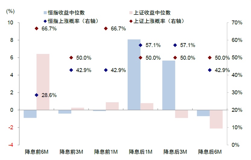 图表:降息后 1-3 个月港股上涨频率超过 50%