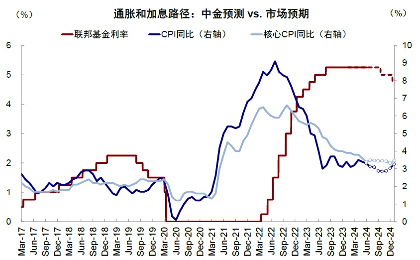 因此,三季度是美联储降息主要窗口期。但与当前市场预期的差别在于,基本面不差的情况下,我们认为年内降息幅度和次数或有限(《测算美债利率的新思路》)。一方面,我们此前多次强调,美联储降息并不需要通胀回落至 2%,而是需要看到通胀有回落至 2% 的趋势。美联储主席鲍威尔周三在美国国会众议院作证时也表示 “降息不必等到通胀降至 2%”[2]。另一方面,复盘美联储历次降息也并非都是应对经济衰退,也有缓和金融风险的预防式降息,因此类似的,在需求仍有韧性的背景下,本次降息美联储只需要等待一个合适的通胀窗口,小幅降息缓解货币政策的限制性和收益率曲线倒挂问题即可,并不需要连续的大幅的降息。
