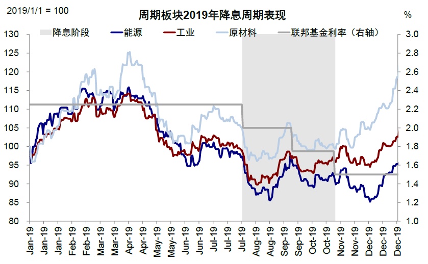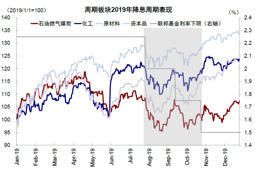 板块方面,2019 年降息前后成长板块受益于流动性改善上涨,但更多表现为局部加杠杆下的结构性行情,当前也是如此。2019 年中美贸易摩擦常态化背景下,国产替代兴起,高端制造为代表的成长板块走强,半导体、电子板块领涨,新能源板块 2019 年底起走强。今年以来分红搭配成长的 “哑铃” 结构行之有效,当前可以进一步把配置方向归纳为整体回报率下行、局部加杠杆、局部涨价三个方向,同样为震荡格局下的结构性行情。