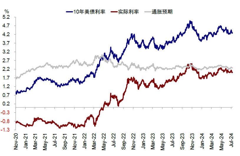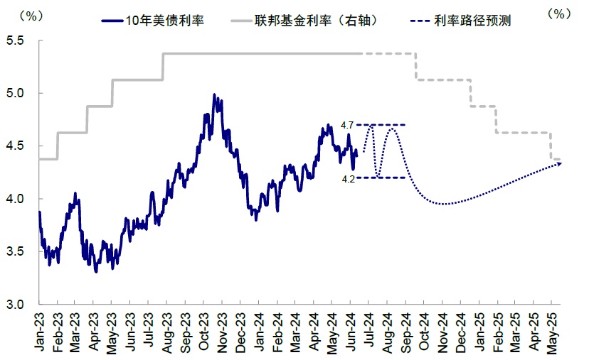受益于降息宽松的资产依然可以交易,但要注意区间且需要及时抽身,降息兑现时可能也是降息交易接近尾声时。根据美债利率与降息预期的关系,美债利率短期内或在 4.2%~4.7% 区间波动,基本对应年内降息 3 次和年内不降息的预期。降息兑现后,利率可能在交易因素下跌破 4%,然后再因增长向好预期而逐步反弹,逐步再转向再通胀受益资产,如铜油等大宗资源品、美股周期板块。与美债类似,黄金也是如此。假设实际利率 1~1.5%,美元 102~106,我们测算黄金合理中枢为 2500 美元/盎司(《全球市场 2024 下半年展望:宽松已过半场》)。