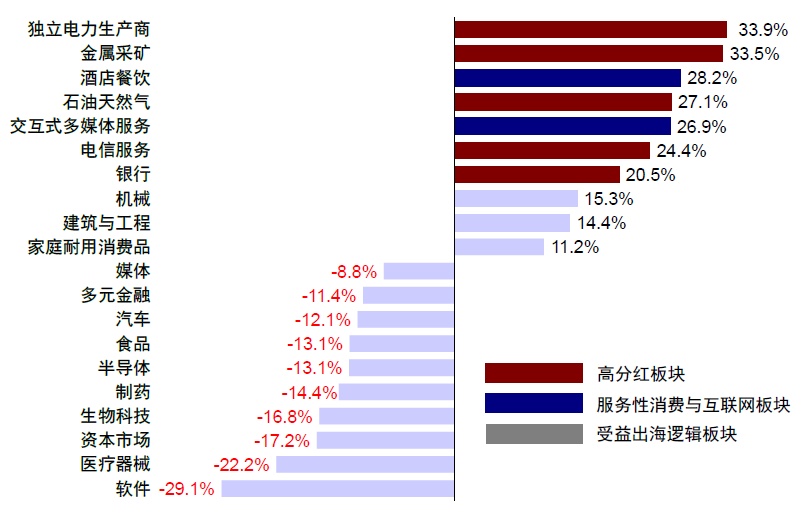 板块配置上,短期降息交易下可以关注流动性受益资产,历史经验显示港股好于 A 股,半导体、汽车(含新能源)行业、媒体娱乐、软件、生物科技等成长板块可能有更高弹性。相反高分红可能阶段跑输,但也是正常现象。但短期流动性驱动并不改变整体配置格局,我们认为除非财政大举发力对冲私人信用收缩,否则仍将呈现震荡格局下的结构性行情,重点聚焦三个方向:整体回报下行(稳定回报的高分红和高回购,即充裕现金流的 “现金牛”)、局部加杠杆(政策支持与仍有景气度的科技成长),局部涨价(天然垄断板块,上游与公用事业)。
