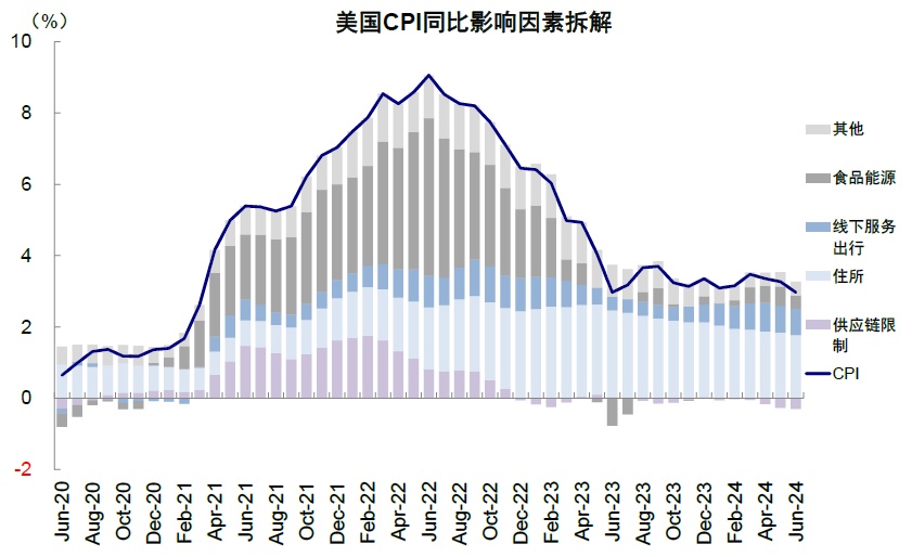 当前决定美联储是否降息的关键因素依然是通胀下行,我们测算三季度通胀有机会快速回落。通胀可能受商品通胀降温、服务通胀逐步回落利好走弱,年内整体 CPI 同比低点或降至 8 月的 2.83%,核心 CPI 低点或降至 11 月的 3.23%。但到年底,无论是单纯基数效应、降息预期交易过度导致通胀回暖还是大选的通胀性政策,都可能导致通胀有一定翘尾风险(我们测算 PCE 在 8 月回落至 2.5% 附近,年底通胀翘尾影响下回升至 2.8%)。