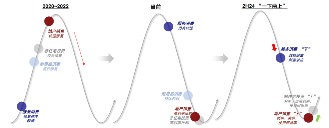 图表:美国本轮经济周期的特征是各环节的明显错位的 “滚动式” 放缓和修复
