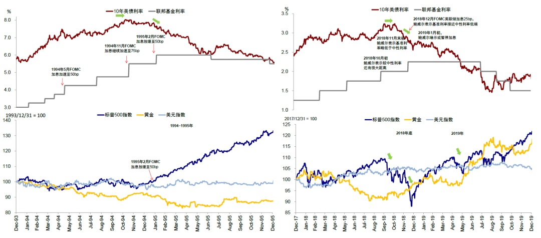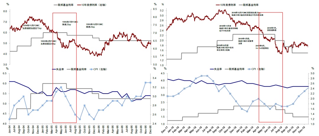 图表:美联储提早降息来防范过度紧缩的风险,如 1995 年和 2019 年,美联储均在经济未衰退时小幅降息 25bp