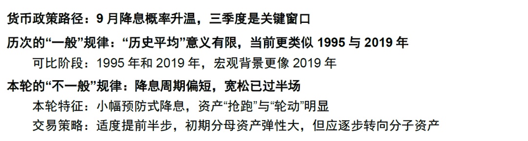 6 月通胀全面降温助力下,9 月降息成为 “大概率事件”。但通胀数据公布当日,本应受益于降息交易的纳斯达克 100 却大跌 2.2%,罗素 2000 小盘大涨 3.6%,中国 AH 股银行地产大涨,贵金属和有色大跌,再度说明本轮降息交易的特殊性,不能将历史常理简单套用,要结合当下环境和情况。即便与当前环境更为相似的 2019 年相比,本轮情况也具有一些特殊性。我们通过复盘 2019 年经验并结合本轮异质性特征,总结以下交易策略供投资者参考: