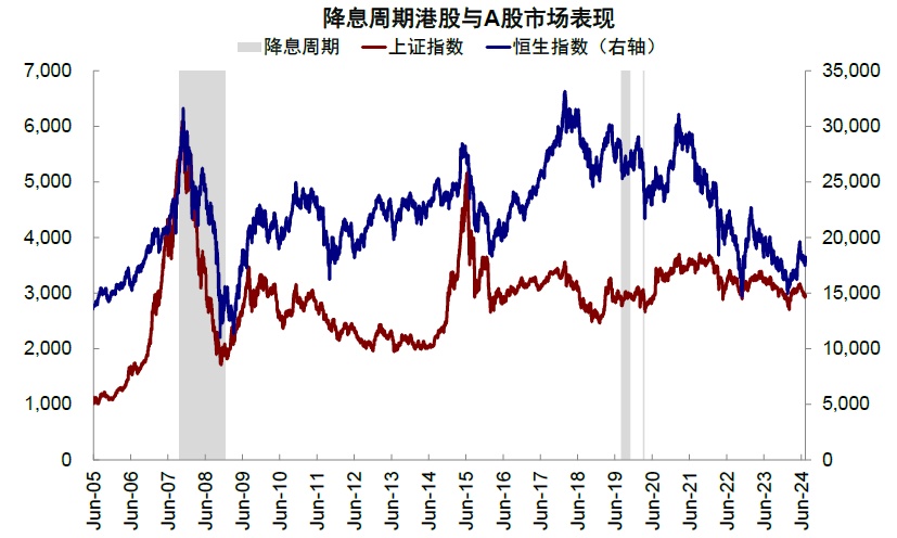 降息初期港股多数跑赢 A 股,成长板块率先受益,但这种影响持续时间有限,市场表现整体受国内基本面影响更大。同样以与当前更为相似的 2019 年为例,2019 年,即便美联储降息,但在中国弱复苏下,市场震荡为 L 型走势,与 2017 年美联储加息但中国强增长下市场上涨,呈现 V 型反弹,形成鲜明对比。说明中美周期错位下美联储政策无法决定国内市场走势,相较外部流动性变化,中国市场走势更依赖于国内基本面表现。进一步看,同样处于降息周期,不同的基本面特征也会对应不同的资产表现,比如 2007-2008 年与 2019 年,中国市场同样处于美联储降息周期,但是 2007-2008 年中国在经济过热、通胀高企下市场初期强势上涨,之后快速回调,而 2019 年局部加杠杆下呈现指数震荡盘整的结构性行情。