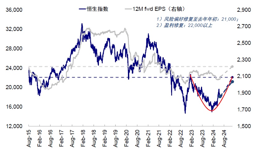 图表:若 10 年美债利率降至 3.8-4%,风险偏好和盈利维持不变,恒指有望接近 18,500-19,000 点
