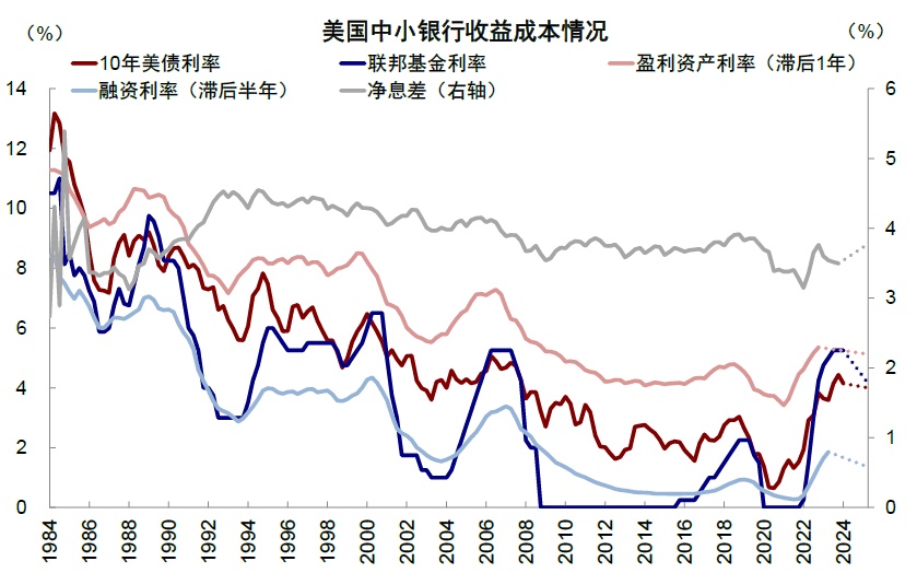 图表:考虑利差压力和金融风险,美联储可能仅共需要降息 100bp 左右,从 5.3% 降至 4.3%