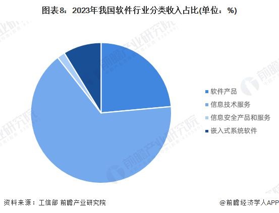 值得一提的是,2023 年,我国软件行业各细分市场发展形势呈现出全部上涨的局面,即软件产品、信息技术服务、信息安全产品和嵌入式系统软件收入市场规模都出现了增长。其中,信息技术服务收入 81226 亿元,同比增长 14.7%,高出全行业整体水平 1.3 个百分点,占全行业收入比重为 65.9%。