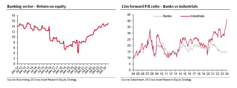 短期内,法兴银行 Benzimra 团队建议投资者减持估值较高的工业板块,转而增持银行股: