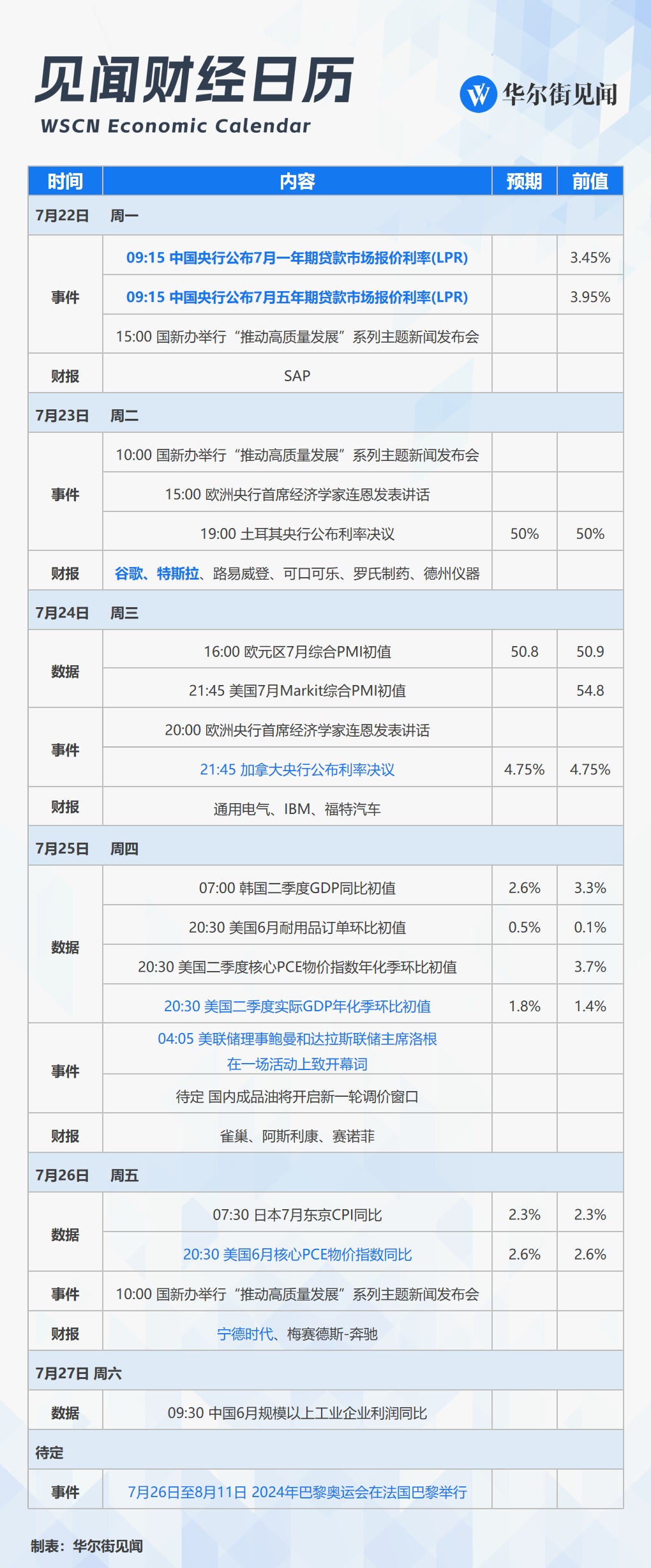 本周重磅日程:LPR 会降息吗?美股科技股财报季和奥运会拉开帷幕,美联储最爱通胀指标出炉