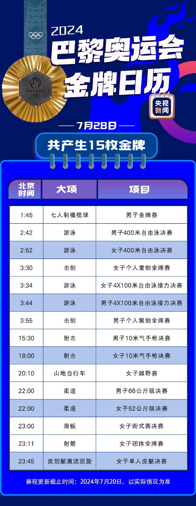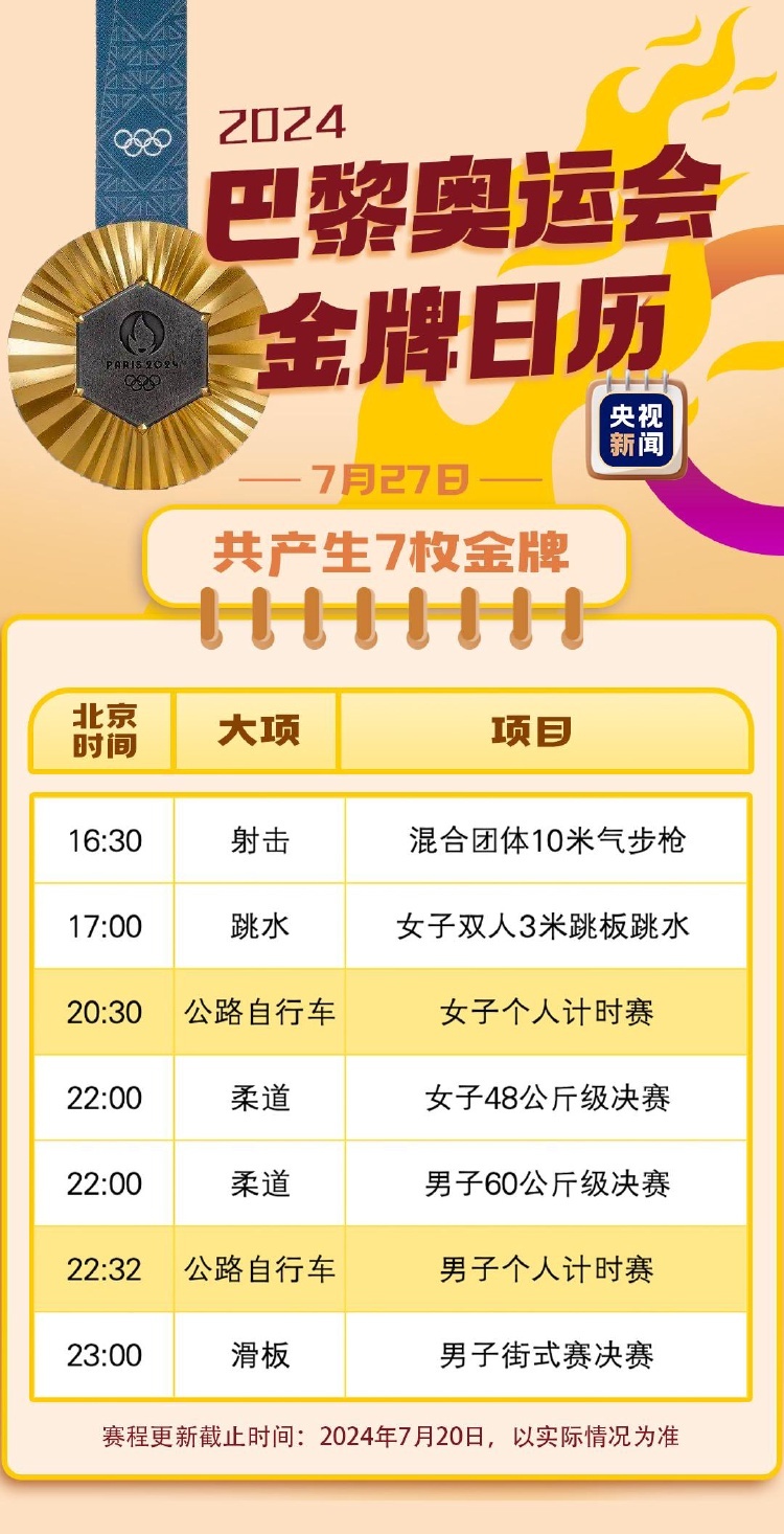 下周 7 月 27 日和 7 月 28 日预计共产生 22 枚金牌。