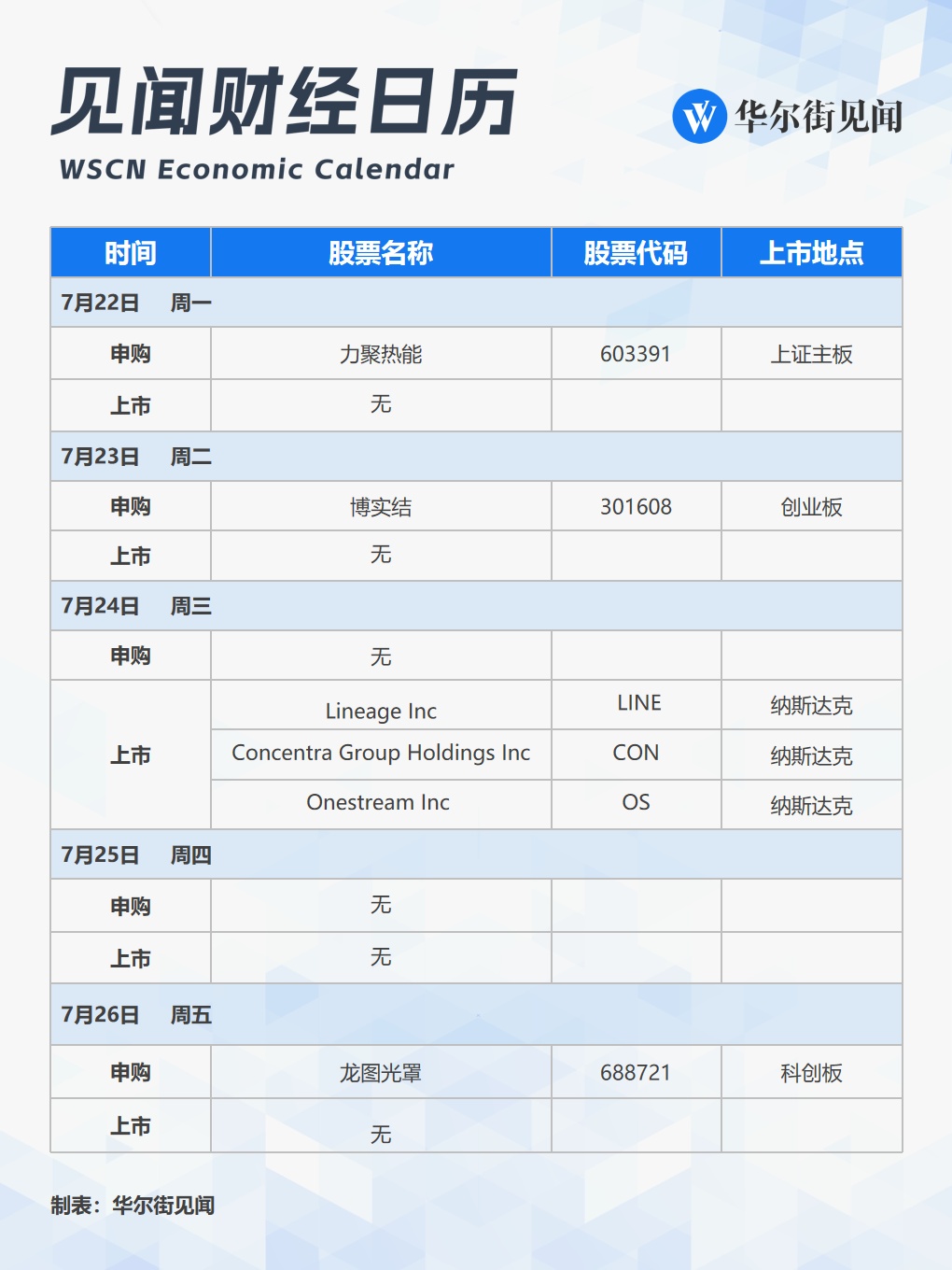 7 月 22 日至 7 月 26 日当周,A 股有 3 只新股发行,分别是力聚热能、博实结、龙图光罩;港股暂无新股上市;美股有 3 只股票上市。