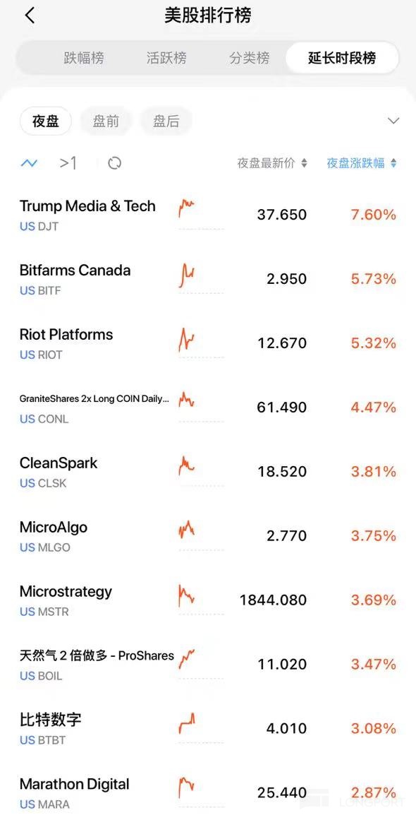 夜盘中,特朗普概念股上涨,DJT 和数字货币概念股涨幅靠前: