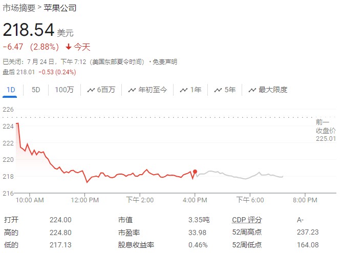 周三,苹果股价收跌 2.88%,跌至 7 月 2 日以来最低。