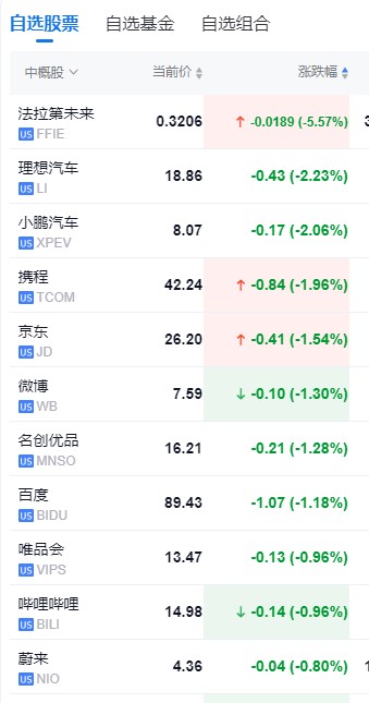 热门中概股多数走低,小鹏汽车跌超 2%,理想汽车跌近 2%,京东、新东方跌超 1%。