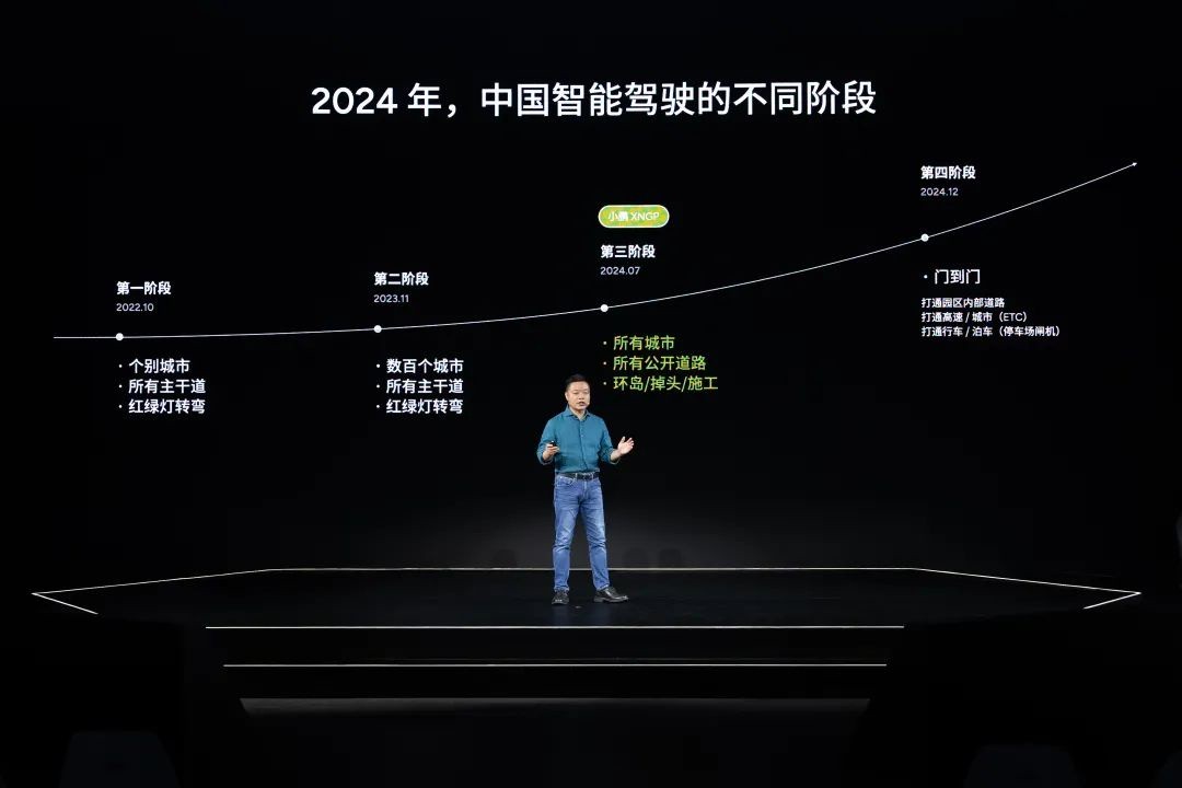 而 7 月份的 XNGP,是何小鹏定义里面,中国智能驾驶四大阶段的第三个:除了园区、闸机、ETC,其他城市公开道路、复杂路况全征服。