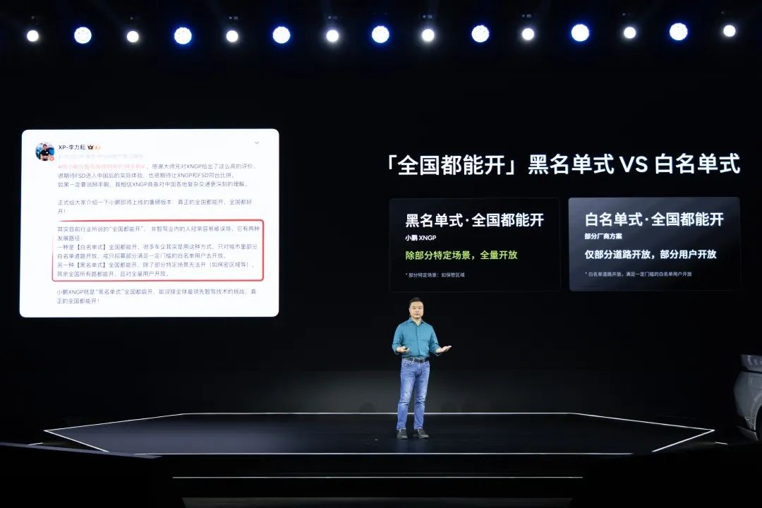 聊到这个话题,何小鹏点到了行业内的「黑白名单」之分:他指出,部分白名单式的所谓「全国都能开」,只是部分道路、部分用户。