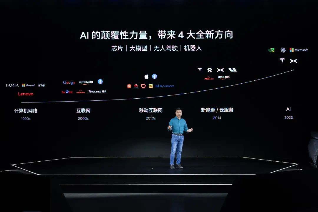 在他看来,这股 AI 趋势中一共有四个浪潮:芯片、大模型、自动驾驶、机器人。