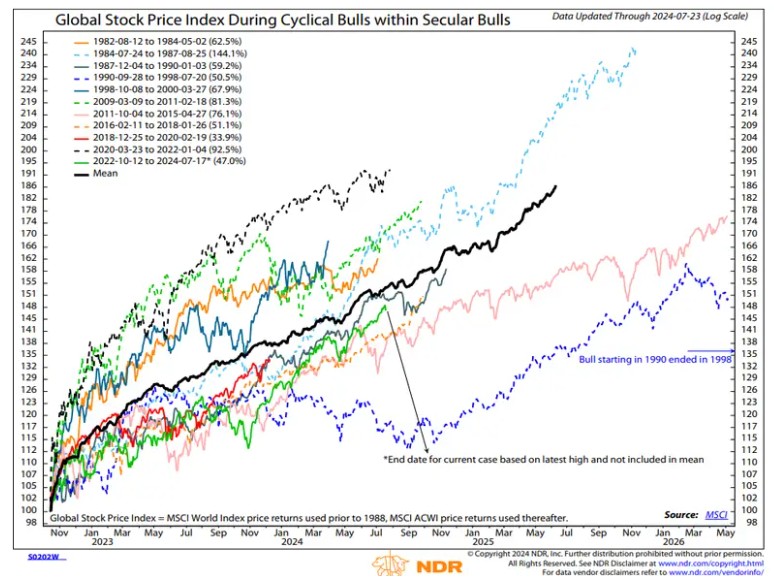 根据奈德 - 戴维斯研究公司(Ned Davis Research)强调的历史趋势,美股始于 2022 年 10 月的周期性牛市反弹将持续到 2025 年。