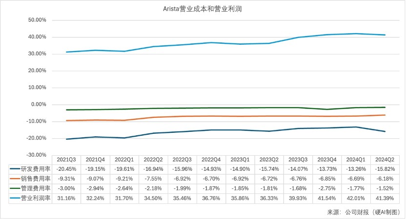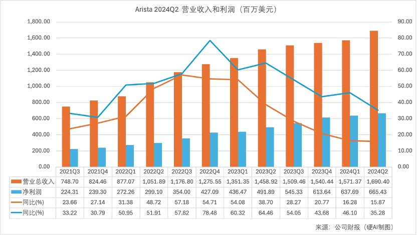 具体来看,2024 年第二季度 Arista 的营业收入和利润均高于预期和指引,公司表示这主要是由于 AI 需求的拉动,不少云客户需要从 100G 升级到 200G 或从 200G 升级到 400G 的网络产品。在利润方面,公司表示,一方面是供应链和库存管理的优化,另一方面是高毛利率的 AI 产品占比提升,使公司本季度利润同比增长了 33%。