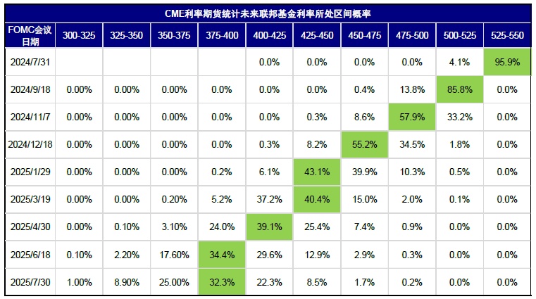 在 9 月降息预期高达 100% 的情况下,投资者非常关注 7 月 FOMC 会议上美联储将如何表态,是否又会出现什么变数,毕竟今年以来降息预期如钟摆一样大幅折返也已让人 “见怪不怪”。从此次会议声明和鲍威尔会后记者会的发言看 [1],美联储对 9 月降息给出了进一步的暗示,强调通胀压力有所缓解,强调同时关注就业和通胀风险的平衡、而非仅是通胀风险,都暗示如果不出意外(通胀在 9 月降息前继续回落),9 月降息应该是大概率事件。