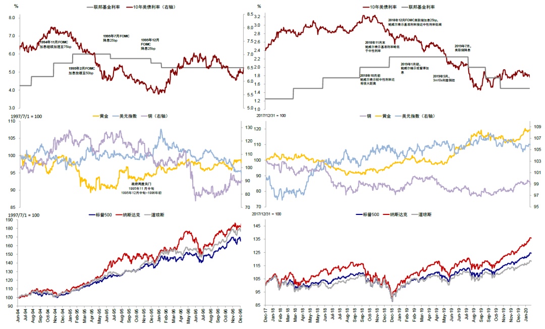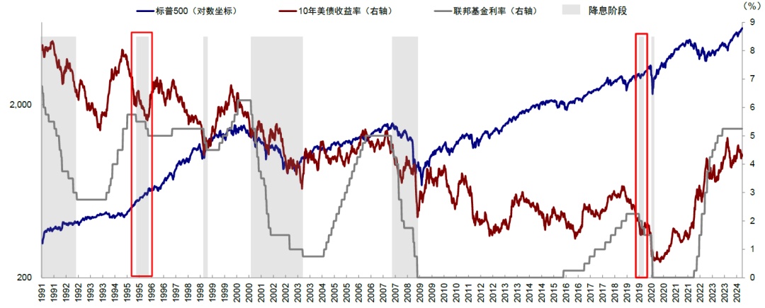 正是由于以上特殊性,相比历次降息都是类似影响路径,此次差异主要体现在节奏上,可能更快且前置,不理解这一点可能会在交易上 “做反”。软着陆预防式降息意味着这种切换相比其他降息周期可能发生的更早,这也是我们强调 “宽松已过半场” 的原因。历史可比阶段如 1995 和 2019 年的三次共 75bp 降息,降息后美债利率、通胀均有所反弹,占优资产再度转向美股和大宗商品。