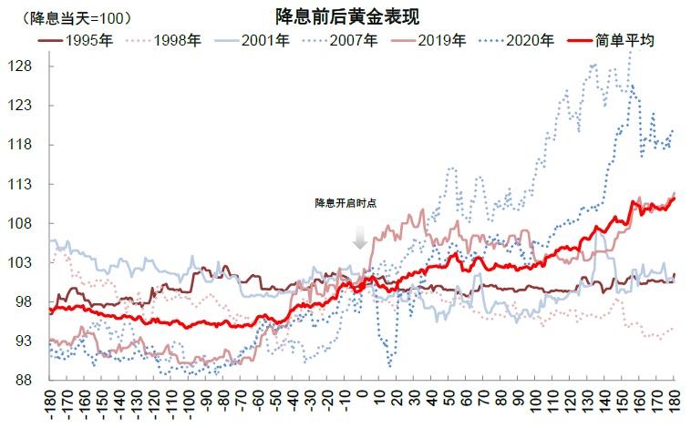 图表:自 1995 年以来的降息周期显示,黄金在降息预期阶段涨幅更高