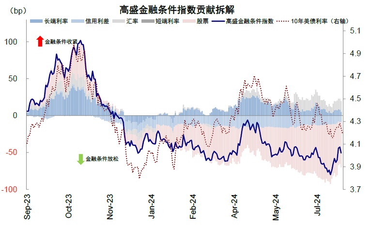 相比短期回调更重要的是,近期风险资产普跌,避险资产也没有大涨,都造成了金融条件和财富效应的收紧,这反而有利于美联储降息的落地。近期波动使得金融条件指数从 7 月 16 日的低点 98.9 升至 99.3,为 6 月 10 日以来新高。金融条件收紧有助于抑制需求和通胀,风险资产波动也对抑制财富效应有一定帮助,这反而有助于促成 9 月美联储降息的落地。年初正是因为过度交易降息导致美联储反而推后降息,正所谓 “越不预期降息才越能降息”。