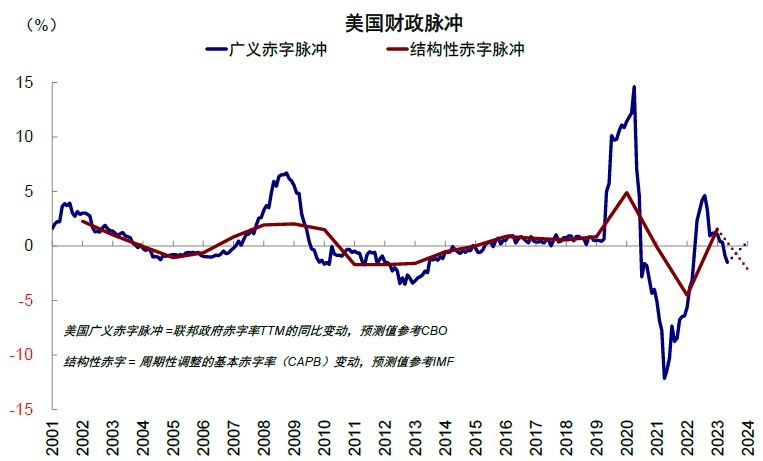 图表:美国 2024 年广义和结构性赤字脉冲或将分别由 2023 年底的 1.1% 和 1.6% 下滑至-1% 和-2.14%