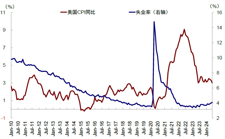 此次会议总体基调偏鸽派,几处措辞的调整都暗示 9 月降息的临近,体现在:1)通胀问题上,认为通胀回落至 2% 的趋势更加明显(some further progress toward the 2% inflation goal,表述中去掉原有的 “modest”),对二季度的通胀回落走势更有信心。2)承认劳动力市场降温(Job gains have moderated),这也是对过去几个月失业率数据上升的追认。3)认为通胀和就业市场目标更为平衡(move into better balance,原表述是 move toward),这也意味着美联储已经不再单纯专注通胀回落至 2% 的目标,也在关注高利率造成的潜在经济风险。鲍威尔同时也表示,不认为就业市场是一个大的通胀来源,因此也不期待短期内看到就业出现快速和剧烈变化,暗含不需要就业市场大幅恶化就可以 “预防式” 降息的意味。