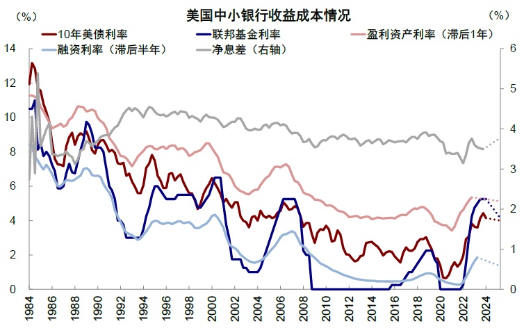 图表:假设 10 年美债利率回到 4% 附近,联邦基金利率回落 100bp 左右可以做到净息差回到疫情前水平