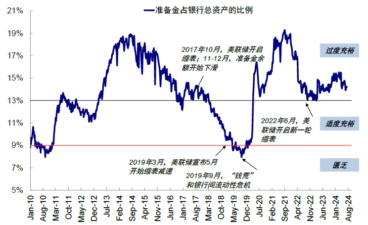 图表:目前美国银行体系准备金依然非常充裕,准备金占银行总资产比例为 14.2%