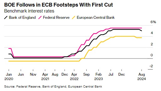 美联储主席鲍威尔周三表示,除非通胀进展停滞,否则官员们将在 9 月降息,美联储可能很快也会加入这一行列。英国央行对未来借贷成本的变化表现出谨慎的态度,会议纪要补充道,官员们将 “在每次会议上决定适当的货币政策限制程度”。