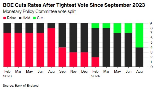 英国央行行长贝利投下决定性一票,将基准利率下调 25 个基点至 5%。会议纪要显示,这一决定对部分支持降息的委员来说是 一种 “微妙平衡” 的结果,而在由九名成员组成的货币政策委员会中,有四名成员反对降息。